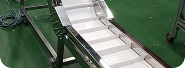 무거운 중량물에는 고무벨트, 경량물인 경우에는 합성수지(PU, PVC) 벨트를 사용하고 있으며 음식류 운반에는 향균, 곰팡이등에 강한 식품용 컨베이어 벨트를 사용하고 있습니다.
